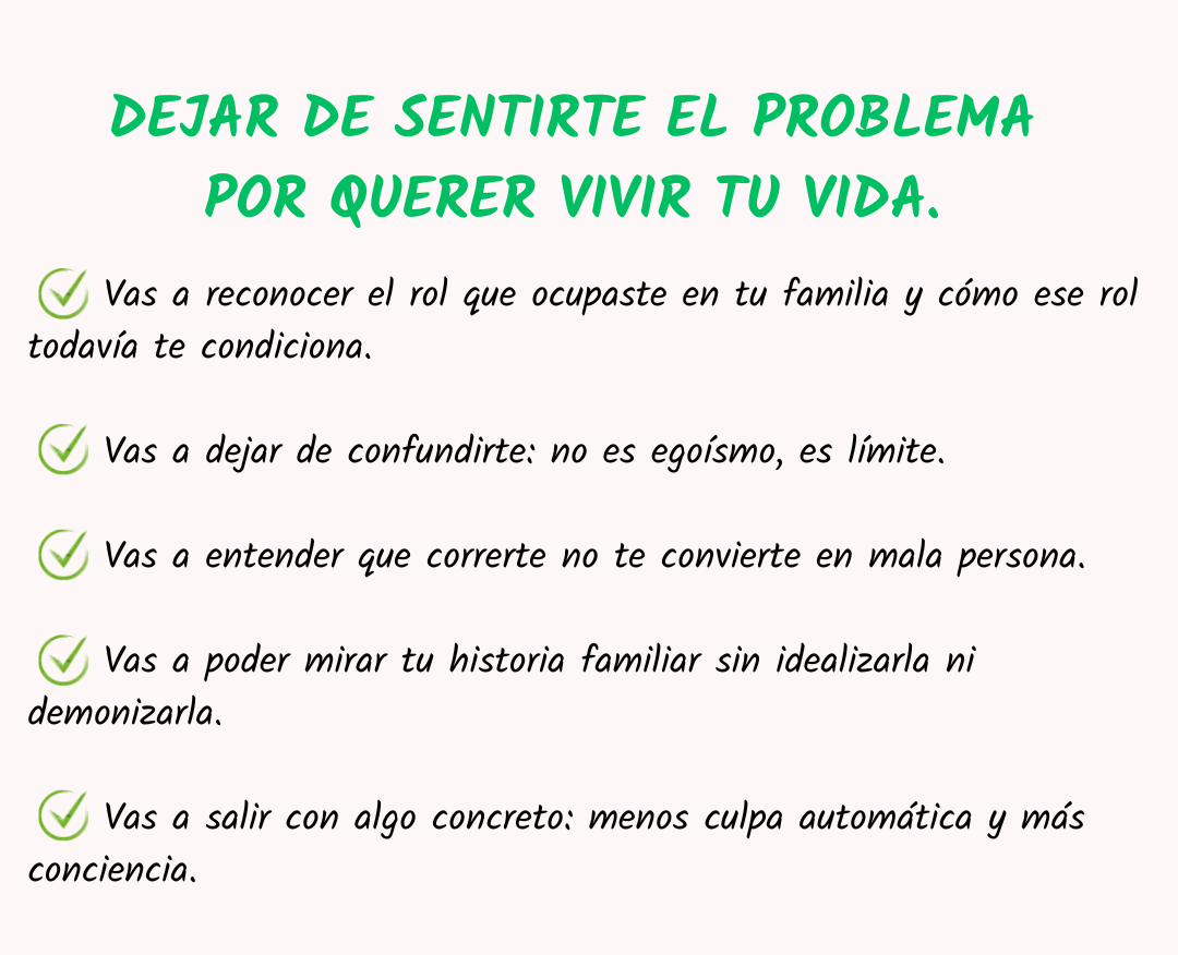 Busca ayudarte a comprender los mandatos, roles y dinámicas que aprendiste, para que puedas mirarlos con más conciencia.